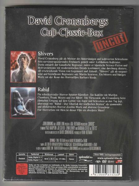 Als einer der ersten Filme, die Cronenberg bekannt gemacht haben, bietet "Shivers" eine faszinierende Mischung aus Horror und Science Fiction. Die Geschichte entfaltet sich in einem abgelegenen Luxusapartmentkomplex, in dem sich ein experimenteller Parasit rasend schnell ausbreitet und die Bewohner in triebgesteuerte Zombies verwandelt. Diese UNCUT-Version lässt keinen Schockmoment aus und garantiert somit echtes Gänsehautfeeling.