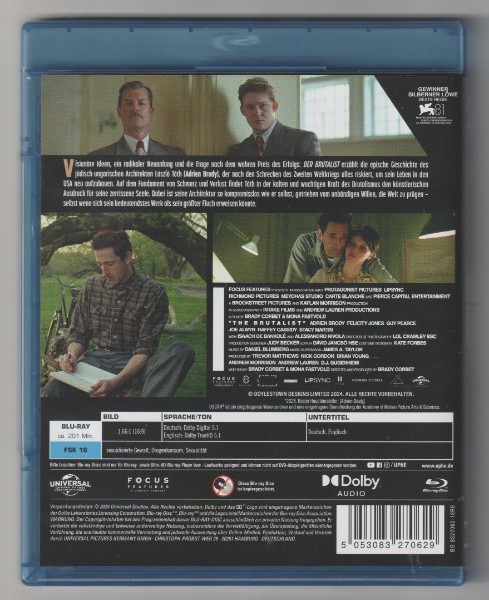 Ausgezeichnet mit 3 Oscars in den Kategorien Bester Hauptdarsteller, Beste Regie und Beste Kamera, verspricht „Der Brutalist“ ein unvergessliches Filmerlebnis. Der Film, freigegeben ab FSK 16, ist ein Muss für alle Liebhaber von tiefgründigen und emotional bewegenden Geschichten, die sowohl die Schwere als auch die Schönheit des Lebens erfassen wollen.