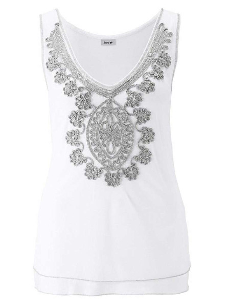 DAMEN TOP 2 LAGIG, GRÖßE 44, WEIß & BEDRUCKT, TIEFER V-AUSSCHNITT, MARKE: HEINE, NEU, FIXPREIS PLUS VERSANDKOSTEN.
