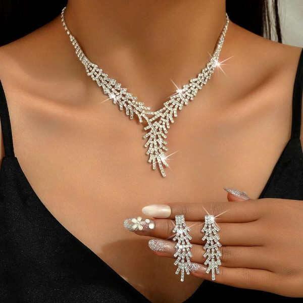 Bezaubern Sie Ihr Umfeld mit diesem exquisiten Modeschmuck Set, das sowohl Eleganz als auch modernes Design in sich vereint. Das Set besteht aus einem Halskette und einem Paar Ohrringe, die mit funkelnden Zirkonia Steinen besetzt sind. Die form der Steine in exquisiter Blatt-Motivik verleiht dem Schmuck eine natürlich-elegante Ausstrahlung, die jedes Outfit aufwertet.