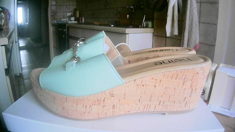 DAMEN PANTOLETTEN, GRÖßE 36, HELLBLAU MIT KETTE, KEILABSATZ 6cm, MARKE: HEINE, ECHT LEDER, NEU MIT KARTON, FIXPREIS PLUS VERSANDKOSTEN.