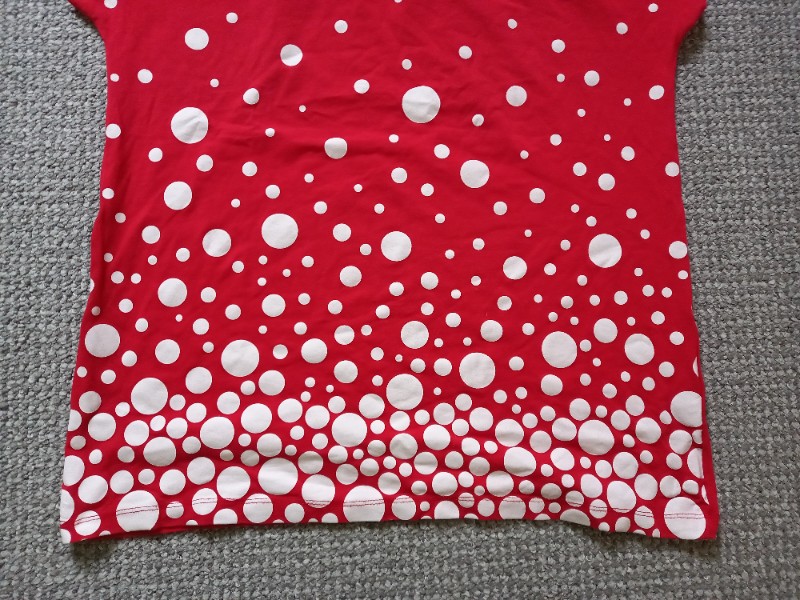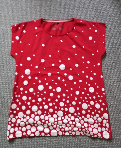 Du suchst ein frisches, unkompliziertes Shirt für jeden Tag, das sofort gute Laune macht? Dieses Damen T-shirt in Größe M (40-42) überzeugt mit einem knalligen Rot und einem verspielten Punkte-/Bubble-Print in Weiß, der nach unten hin dichter wird – ein echter Hingucker, ohne aufdringlich zu wirken.