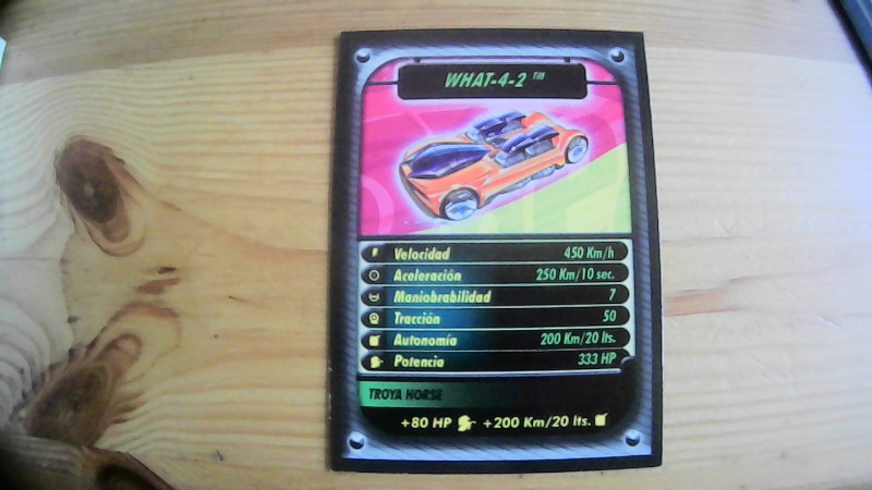 Die Karte zeigt das beeindruckende Modell „WHAT-4-2™“, das mit seiner leuchtend orange und pinken Lackierung sofort ins Auge sticht. Die technischen Spezifikationen des Autos sind beeindruckend: Eine Höchstgeschwindigkeit von 450 km/h und eine Beschleunigung, die bei 0 auf 250 km/h in nur 10 Sekunden schnellt. Auch die Manövrierfähigkeit und Traktion lassen mit Werten von 7 bzw. 50 keine Wünsche offen, während die Autonomie von 200 km/20 l.s und eine beeindruckende Potenz von 333 HP das Bild eines perfekten Rennautos vervollständigen.