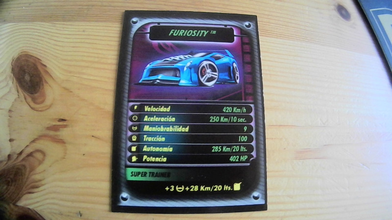 Die Karte zeigt detaillierte Spezifikationen des Fahrzeugs, darunter eine Höchstgeschwindigkeit von 420 km/h und eine beeindruckende Beschleunigung von 250 km/10 Sekunden. Diese Werte heben die Überlegenheit der Furiosity in Sachen Geschwindigkeit und Beschleunigung hervor. Die Traktion von 100 und eine Manövrierfähigkeit von 9 punkten auf die ausgezeichnete Handhabung und Stabilität des Fahrzeugs hin. Darüber hinaus verzeichnet die Karte eine Autonomie von 285 km/20 Stunden und eine beeindruckende Motorleistung von 402 HP, welche die Furiosity zu einer wahren Kraftmaschine machen.
