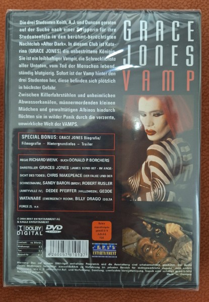 Bist du bereit für ein unvergessliches Horrorerlebnis mit einem Hauch von Kultcharakter? Dann ist "Grace Jones - Vamp - UNCUT Version NEU & OVP" genau das Richtige für dich! Tauche ein in eine Welt, die von der faszinierenden Grace Jones in einer ihrer ikonischsten Rollen geprägt ist.