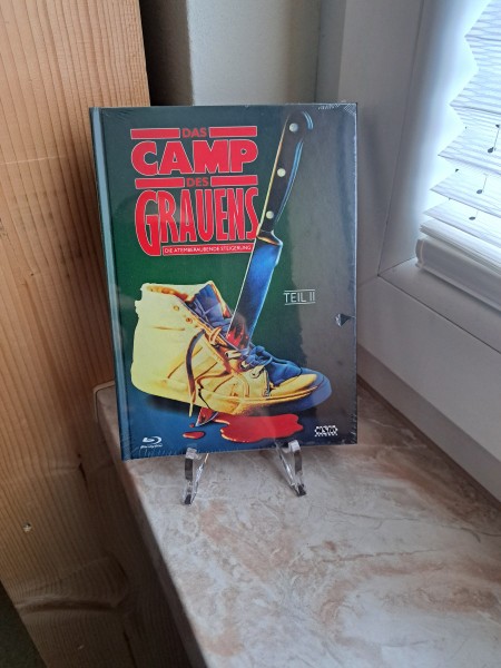 Das Cover des Mediabooks fängt die düstere Atmosphäre des Films optimal ein. Gezeigt wird ein blutrünstiges Messer, das durch ein Paar gelbe Camp-Schuhe sticht – eine Anspielung, die keine Fragen zum Genre offenlässt. Der Titel „Das Camp des Grauens – Teil II“ ist prominent platziert und verspricht eine Fortsetzung der unheimlichen Ereignisse, die Fans bereits aus dem ersten Teil kennen.