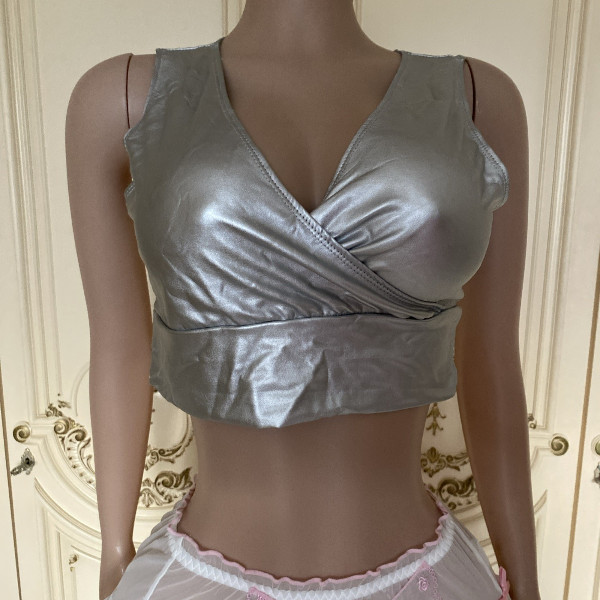 Das Top überzeugt mit einem edlen silberfarbenen Glanz-Finish, das im Licht wunderschön reflektiert und jedem Outfit sofort einen trendigen, leicht futuristischen Touch verleiht. Der Schnitt ist bauchfrei und setzt Deine Taille attraktiv in Szene - perfekt, wenn Du High-Waist-Jeans, Röcke oder eine coole Lederhose kombinieren möchtest.