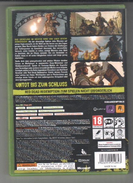 Undead Nightmare kombiniert eine schockierende Einzelspieler-Kampagne mit einer kompletten Sammlung fesselnder Multiplayer-Inhalte zu einem der größten Spiele dieses Jahres: Red Dead Redemption. Mit einer Reihe neuer, innovativer Varianten klassischer teambasierter und jeder-gegen-jeden-Matches und einem revolutionären Freien Modus, der anders ist als alles, was man bisher gesehen hat, bietet Undead Nightmare alle Multiplayer-Modi aus Red Dead Redemption zusammen mit allen herunterladbaren Inhalten, die bisher veröffentlicht wurden, und legt die Messlatte für Multiplayer in einer offenen Welt höher. Die ohne das Hauptspiel lauffähige Disk-Version von Red Dead Redemption: Undead Nightmare enthält zum ersten Mal als Bundle das „Undead Nightmare“-Paket, das Koop-Missions-Paket „Outlaws bis zum Schluss“, das „Legenden und Schurken“-Paket, das „Lügner und Betrüger“-Paket und alle bisher erschienenen Inhalte für den Freien Modus im Multiplayer enthalten. Undead Nightmare ist ein eigenständiges Produkt. Red Dead Redemption ist NICHT erforderlich, um Undead Nightmare spielen zu können.