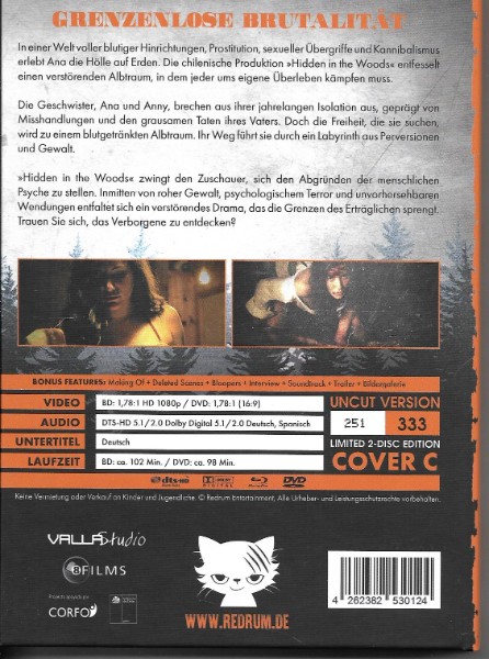 Dieses Collector''s Item ist perfekt für alle, die neben spannenden Filmerlebnissen auch Wert auf eine ästhetisch ansprechende Präsentation legen. Die hochwertige Verpackung und das beindruckende Cover-Design machen "Hidden in the Woods - Media Book" zu einem Muss für Sammler und Fans des extremeren Filmgenusses.