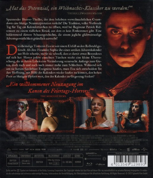 Die ehemalige Tänzerin Eva ist seit einem Unfall an den Rollstuhl gefesselt. Als ihre Freundin Sophie ihr einen antiken Adventskalender aus Holz schenkt, merkt sie schnell, dass es damit etwas Besonderes auf sich hat: Hinter jedem einzelnen Türchen steckt eine kleine Überraschung, die in ihrem Leben eine Veränderung verursacht. Anfangs zum Guten, doch nach und nach auch immer mehr zum Schlechten. Während sich um sie herum furchtbare Ereignisse häufen, muss Eva sich entscheiden: Ist ihre Hoffnung, mit Hilfe des Kalenders wieder laufen zu können, den hohen Preis an blutigen Opfern wert, den der Kalender im Gegenzug fordert?
