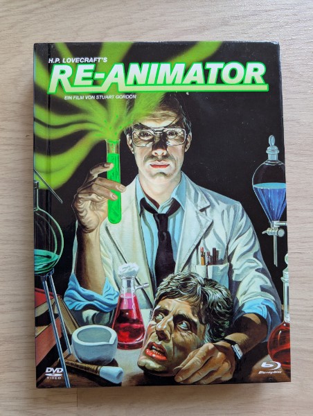 Das auffallende Cover dieses Mediabooks zieht sofort die Aufmerksamkeit auf sich. Es zeigt eine intensiv illustrierte Szene aus dem Film, mit Dr. Herbert West, der eine leuchtende, grüne Reagenz in der Hand hält, während sich darunter das Gesicht eines beunruhigten Mannes abzeichnet. Dieses Kunstwerk erzeugt sofort eine düstere und geheimnisvolle Atmosphäre, die perfekt zur Stimmung des Films passt.