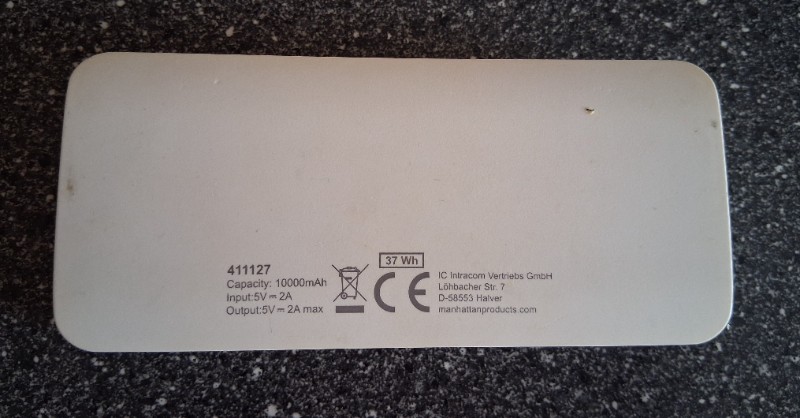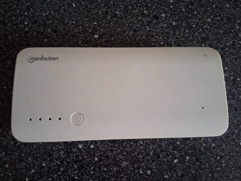 Praktische Powerbank von Manhattan, ideal zum Aufladen von Smartphones, Tablets oder anderen Geräten unterwegs.