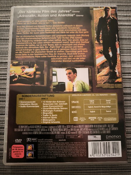Zusatzmaterial: Die 2-Disc Special Edition kommt geladen mit Extras, die tiefer in die Entstehung und Bedeutung von "Fight Club" eintauchen lassen. Von Hinter-den-Kulissen-Dokumentationen bis zu Interviews mit den Machern und Darstellern – diese Edition ist ein Muss für jeden Sammler und Filmfan.