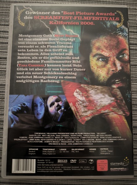 "Delivery" ist nicht nur irgendein Horrorfilm. Er wurde beim Screamfest 2006 als bester Film ausgezeichnet, was seine außergewöhnliche Qualität und seinen Erfolg in der Horror-Community unterstreicht. Die DVD-Ausgabe bietet dir nicht nur die Möglichkeit, den Film in voller Länge zu genießen, sondern auch, Einblick in hinter die Kulissen zu bekommen, was den Film für Genre-Liebhaber noch interessanter macht.