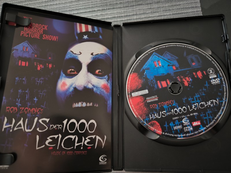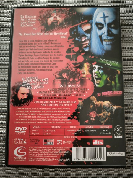 Die DVD präsentiert sich in einem aufsehenerregenden Cover, das schon allein beim Anblick einen Schauer über den Rücken jagt. Die grellen Farben und das furchteinflößende Bild von Captain Spaulding, gespielt von Sid Haig, lassen die düstere Atmosphäre des Films erahnen.