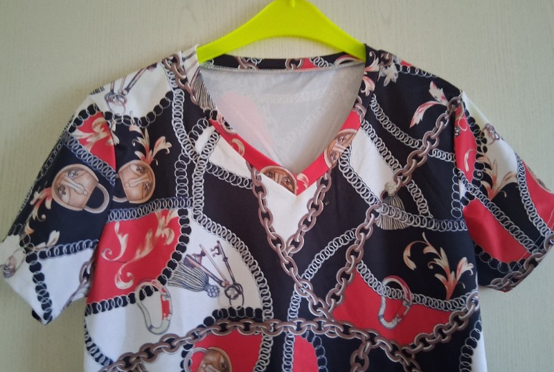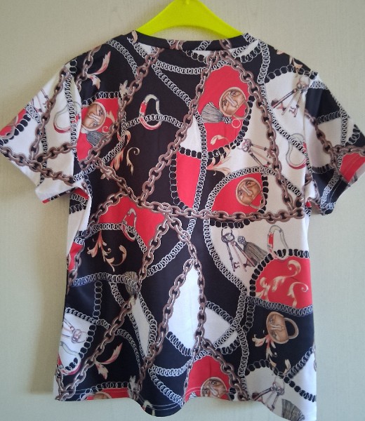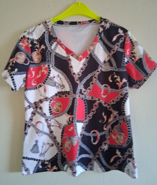 Auf dem Bild siehst Du ein kurzärmeliges Damen-T-Shirt mit V-Ausschnitt und einem ausdrucksstarken Allover-Print: Ketten, ornamentale Details und Patchwork-Flächen in Schwarz, Weiß und kräftigem Rot. Der Look erinnert an klassische, elegante Motive - perfekt, wenn Du Mode magst, die ein bisschen „Premium-Feeling“ ausstrahlt und trotzdem unkompliziert bleibt.