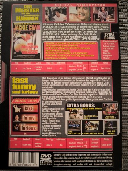 Ob Du nun ein langjähriger Fan von Jackie Chan bist oder einfach nur spannende Actionfilme liebst, die "Jackie Chan: Masters Edition" ist eine lohnende Investition. Hol Dir die atemberaubende Action nach Hause und erlebe Stunden voller Unterhaltung und Nervenkitzel. Lass Dir diese Chance nicht entgehen, die Meisterwerke eines der größten Actionhelden aller Zeiten zu besitzen.