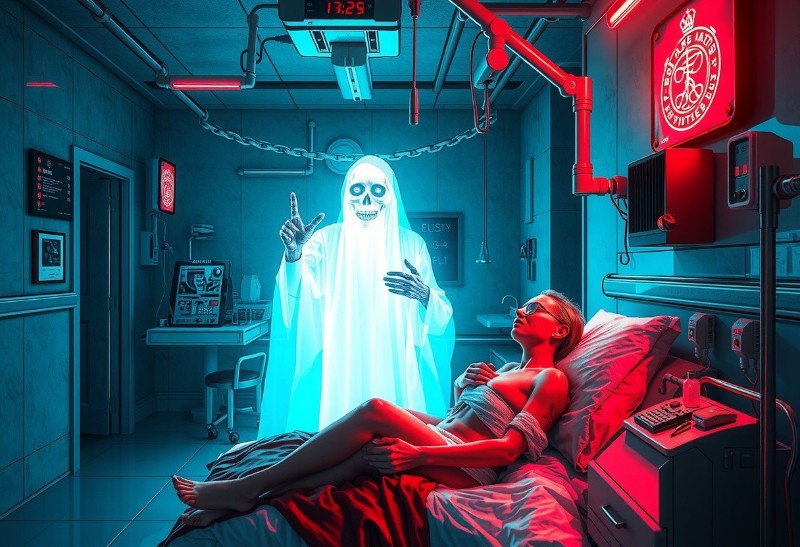 Im Zentrum liegt ein verführerisches Girl auf einem Krankenhausbett – lasziv, selbstbewusst, in einer Pose, die zugleich verletzlich und dominant wirkt. Die Klinik-Atmosphäre mit Monitoren, Technik und klaren Linien sorgt für diesen „verboten“-Kick – als würdest Du in einen Moment blicken, der eigentlich nicht für fremde Augen bestimmt ist. Direkt daneben: eine geisterhafte Gestalt im weißen Laken – unheimlich präsent, fast spielerisch, wie ein „Wächter“ dieser surrealen Nacht. Genau dieser Kontrast macht das Bild so besonders: nackte Erotik trifft auf Geist-Fantasie, Sinnlichkeit auf Mystery.