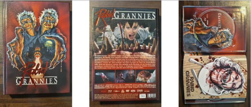 Besonders stark: die Innenansicht. Die Disc-Gestaltung greift das Horror-Thema kompromisslos auf – inklusive blutigem Motiv und passend illustriertem Rabid Grannies-Schriftzug. Dazu kommt das klare Mediabook-Layout mit stabiler Halterung – genau das, was Du bei einem Limited Mediabook erwartest: nicht einfach nur eine Hülle, sondern ein Präsentationsstück für Fans des Genres Blu-ray, Horror.