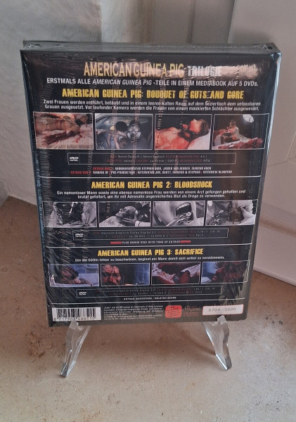 Du bekommst mit dem American Guinea Pig Trilogy Mediabook OVP genau das, was auf dem Foto zu sehen ist: ein eingeschweißtes American-Guinea-Pig-Trilogie-Mediabook mit markantem Coverdesign – bereit, entweder als Sammlerstück unangetastet zu bleiben oder von Dir ausgepackt und zelebriert zu werden.