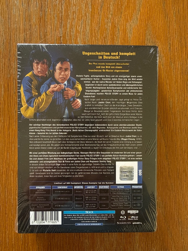 Wenn Du auf kompromisslose Action stehst und Dir ein Stück Hongkong-Kinogeschichte ins Regal holen willst, ist das Police Story Trilogy Mediabook OVP genau das Richtige. Auf dem Bild siehst Du die Nameless – Limited Mediabook Edition im eingeschweißten Originalzustand – ein echtes Sammlerstück, das schon durch sein markantes Artwork sofort signalisiert: Hier geht’s um Tempo, Stunts und ikonische Polizeifilm-Energie.