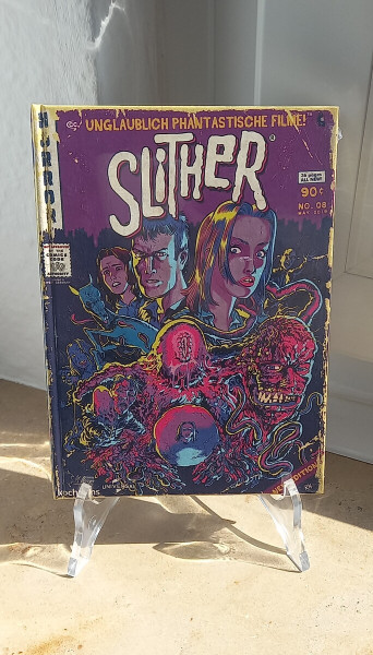 Das Mediabook steht sauber auf einem transparenten Display-Ständer, wirkt stabil und ist ein echter Blickfang: zentral der große SLITHER-Schriftzug, darüber der markige Spruch „Unglaublich phantastische Filme!“ und darunter eine wilde Collage aus Figuren, Tentakeln und schleimigem Kreaturen-Chaos. Dieses Design schreit förmlich nach Creature-Feature, Body-Horror und dem Gefühl, gleich in eine herrlich eskalierende Horrornacht abzutauchen.