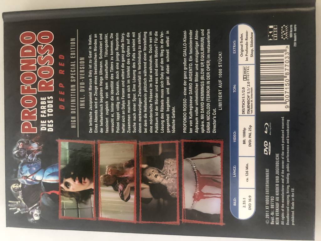 Wenn Du auf der Suche nach einem echten Highlight für Dein Horror-Regal bist, ist das „Profondo Rosso - Die Farbe Des Todes Mediabook“ ein Volltreffer: ein stilvolles Sammlerstück, das schon allein durch sein ikonisches Artwork sofort klar macht, in welche Richtung die Reise geht – Giallo, Spannung und eine Atmosphäre, die Dir langsam unter die Haut kriecht.