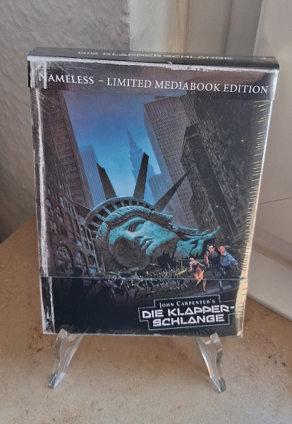 Auf dem Bild siehst Du eine Nameless – Limited Mediabook Edition von John Carpenter’s Die Klapperschlange – eingeschweißt in OVP (Originalverpackung) und damit ideal für Sammler, die Wert auf Zustand und Werterhalt legen. Das Cover-Artwork zeigt die ikonische, zerstörte Freiheitsstatue im urbanen Endzeit-Setting – ein Blickfang, der die Stimmung des Films perfekt einfängt und Deinem Horror-/Sci-Fi-Regal sofort Charakter verleiht.