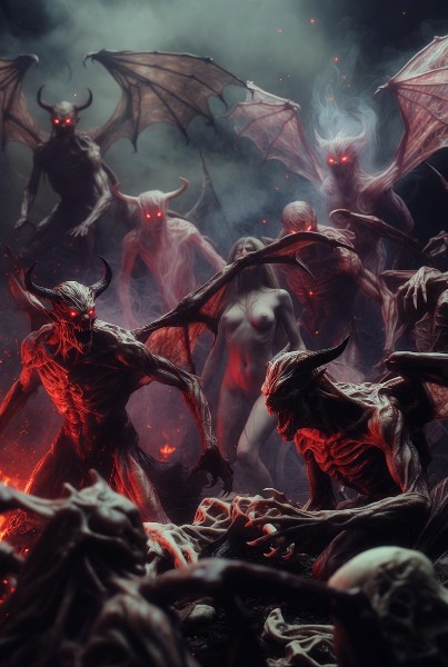 Dieses Motiv lebt von seinem dramatischen Bildaufbau: Im Vordergrund dominieren kräftige, hornbewehrte Dämonenfiguren mit glühenden, rot akzentuierten Körperstrukturen. Dahinter tauchen weitere Monster aus Nebel und Schatten auf - einige mit ausgebreiteten, fledermausartigen Flügeln. Mittig zieht eine nackte, weibliche Silhouette den Blick an: verletzlich und zugleich selbstbewusst, wie ein Mittelpunkt der Begierde in einer Welt, die bedrohlich flüstert. Das Zusammenspiel aus Erotik und dunkler Mythologie wirkt provokant, künstlerisch und absolut hypnotisch.