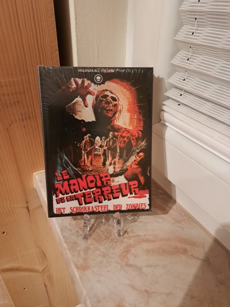 Wenn Du auf der Suche nach echtem, dreckigem Euro-Horror bist, der schon beim Cover Gänsehaut macht, dann ist „Die Rückkehr der Zombies Mediabook Ovp.“ genau Dein Ding. Auf dem Bild siehst Du ein eingeschweißtes Mediabook im Hochformat – präsentiert auf einem kleinen Ständer – mit einem knalligen, ikonischen Artwork: eine bedrohliche Zombie-Fratze im rötlichen Licht, greifende Hände, und darunter eine Gruppe verängstigter Figuren. Genau diese Mischung aus Retro-Illustration und brutaler Atmosphäre macht das Teil zum Blickfang in jeder Sammlung.