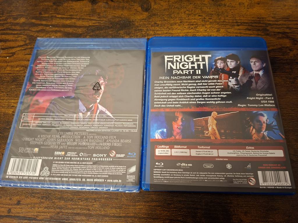 Diese limitierte Edition von "FRIGHT NIGHT 1&2" in uncut Version ist ein echtes Sammlerstück. Nicht nur für Horror-Fans, sondern auch für Liebhaber seltener Filmraritäten. Die Blu-Rays kommen in einer attraktiven Verpackung, die jedem Regal einen Hauch von Mystery und Charme verleiht.