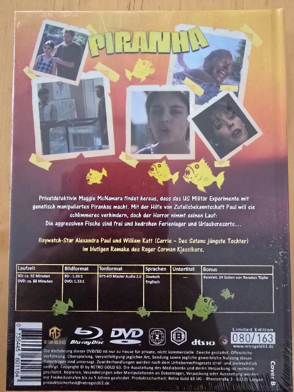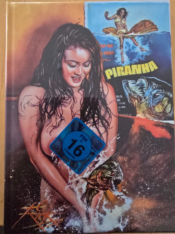 Das Artwork macht sofort klar, in welche Richtung es geht: knallige, klassische Horror-Illustration mit bedrohlichem Piranha-Motiv und der typischen 70s/80s-Genre-Atmosphäre. Dieses Mediabook wirkt wie gemacht für Fans, die nicht nur den Film feiern, sondern auch Wert auf eine starke Optik im Regal legen. Vorne sichtbar ist außerdem die FSK 16-Kennzeichnung – ideal, wenn Du Deine Sammlung ordentlich und transparent halten willst.