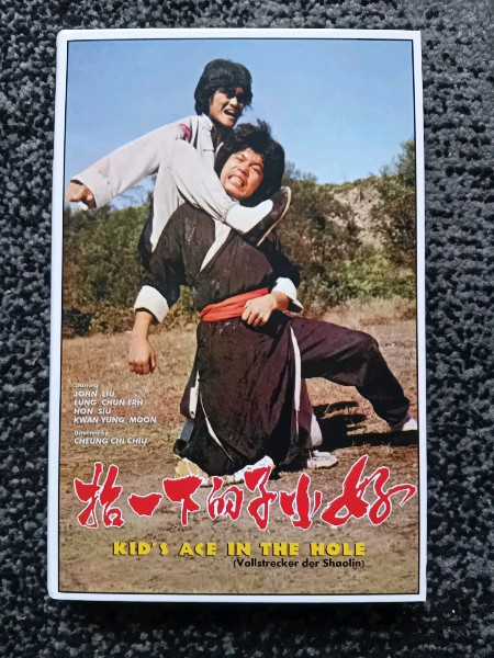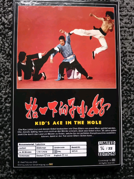 Der Titel ist auf dem Cover klar benannt: „Kid’s Ace in the Hole (Vollstrecker der Shaolin)“ – und genau diese Kombination aus internationalem und deutschem Namen macht den Release auch für Sammler interessant, die gezielt nach der VOLLSTRECKER der SHAOLIN COVER A suchen. Außerdem sind auf dem Cover die Darsteller aufgeführt, darunter John Liu, Wong Chun Erh, Hon Ying und Kwan Yung Moon – ein Hinweis darauf, dass Du Dich auf klassisches Eastern-Kino mit echtem Martial-Arts-Fokus einstellen kannst.
