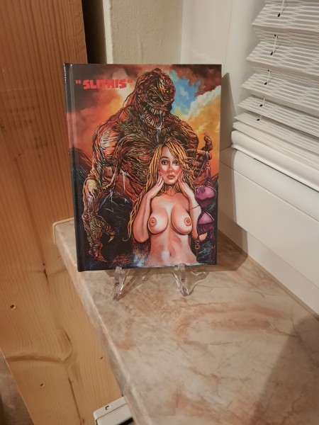 Wenn Du auf der Suche nach einem echten Hingucker für Dein Horror-Regal bist, ist „Slithis Mediabook Ovp.“ genau das Richtige: Auf dem Bild siehst Du ein hochwertig wirkendes Mediabook im typischen Sammler-Format – aufgestellt auf einem Display-Ständer – mit einem extrem markanten, handgezeichneten Covermotiv. Der Titel „SLITHIS“ prangt oben, darunter dominiert ein brachiales Kreaturen-Design: eine massige, reptilienartige Horror-Gestalt im Hintergrund und eine schockierend-ikonische, provokante Illustration im Vordergrund. Genau diese Mischung aus Creature-Horror und B-Movie-Ästhetik macht den Reiz aus – kompromisslos, auffällig, kultig.