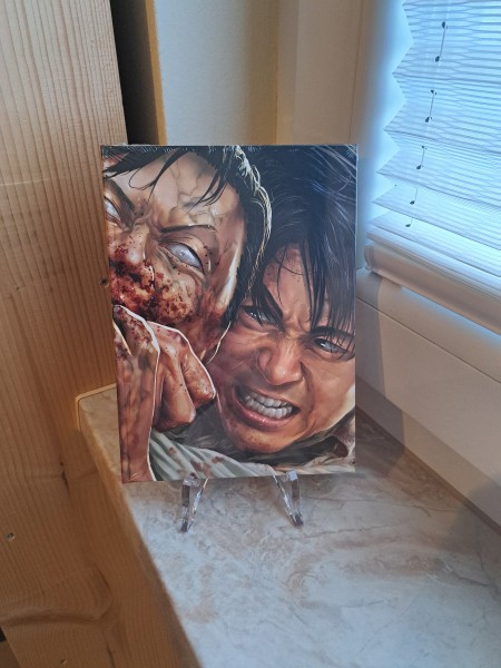 Wenn Du auf der Suche nach einem echten Hingucker für Deine Blu-ray, Action-Sammlung bist, dann ist das Train to Busan Mediabook Ovp. genau die Art von Edition, die man nicht einfach nur ins Regal stellt – sondern immer wieder in die Hand nimmt. Auf dem Bild siehst Du das Mediabook im aufrechten Stand: ein markantes, intensiv gemaltes Covermotiv mit zwei gezeichneten Gesichtern in extremer Nahaufnahme – roh, düster und voller Spannung. Allein dieses Artwork transportiert sofort das Gefühl von Panik, Enge und Überlebenswillen, für das „Train to Busan“ so gefeiert wird.