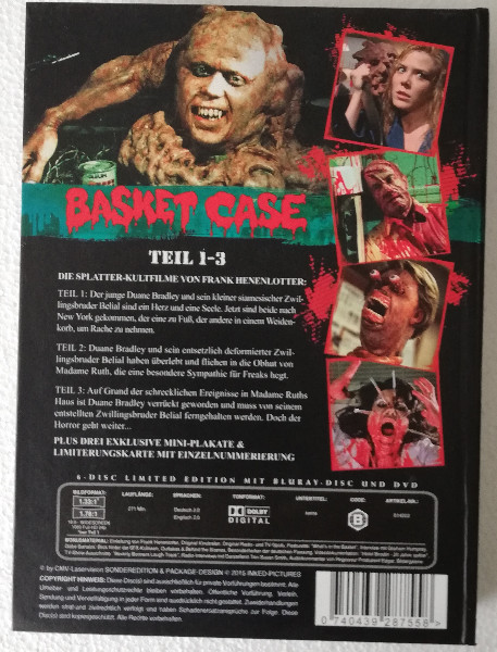 Tauchen Sie ein in die düstere Welt von "Basket Case" mit dieser exklusiven, ungeschnittenen 6-Disc Limited Edition. Diese Komplett-Trilogie gehört zu den kultigsten Horrorreihen überhaupt und verspricht unvergessliche, gruselige Stunden. Jeder Film der Trilogie erzählt die verstörende Geschichte von Duane Bradley und seinem deformierten Zwillingsbruder Belial, den er in einem Korb mit sich herumträgt. Die düsteren Abenteuer der beiden Brüder sind legendär und bieten eine Mischung aus Horror, Wahnsinn und schwarzem Humor.