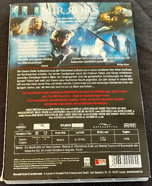 Gönnen Sie sich diesen besonderen Nervenkitzel und erleben Sie erstklassigen Horror, der unter die Haut geht. Die DVD "Mirrors" ist ein Juwel jeder Filmsammlung und ein absoluter Hingucker für jeden Liebhaber des Horrorfilms. Zögern Sie nicht und sichern Sie sich dieses herausragende Exemplar, um Ihrer Sammlung das gewisse Etwas zu verleihen.