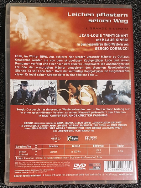 Auf der DVD erwartet dich die restaurierte, ungekürzte Fassung - also genau die Version, die du willst, wenn du den Film wirklich komplett erleben möchtest. Dazu kommt die starke Besetzung: Klaus Kinski und Jean-Louis Trintignant stehen groß auf dem Cover und sind ein echtes Argument für Fans des Genres. Und mit Sergio Corbucci als Regisseur holst du dir einen Namen ins Haus, der im Western-Bereich einfach Gewicht hat.