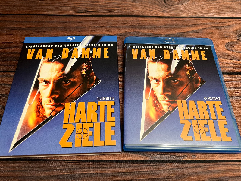 Wenn Du kompromisslose 90er-Action liebst, ist „Harte Ziele - Unrated Version Blu-Ray“ genau Dein Filmabend-Material. Auf dem Bild siehst Du den Titel gleich in zwei Varianten: einmal als Blu-ray im blauen Amaray-Case und dazu ein passendes Cover/Einleger im Stil eines Mediabooks/Slipcovers (mit identischem Artwork). Dominant: Jean-Claude Van Damme – und genau diese Energie bekommst Du hier auch auf den Bildschirm.
