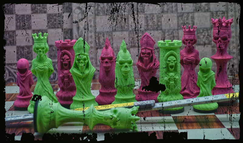 Die Läufer - Todespriester, in zerfetzten Roben. Ihre Gesichter aus Knochen - erhoben in stummer Beschwörung. Die Dame - eine Hexenkönigin, ihr Umhang scheint zu leben, ihre Krone aus Dornen pulsiert, als würde sie das Blut der Gegner trinken. Und der König? Er ist kein Herrscher, sondern ein dunkler Gott, thronend auf einem Sockel, seine Augen leer, seine Macht absolut.
