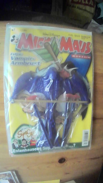 Das absolute Highlight bei dieser Ausgabe ist die Beilage: die „Extra Vampir-Armbrust“. Genau dieses Extra macht Heft Nr. 47/2003 zu einem kleinen Zeitkapsel-Moment – typisch Micky Maus: verspielt, actionreich und mit dem besonderen Gimmick, das man als Kind unbedingt haben wollte.