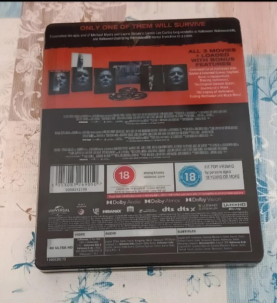Mit dem Halloween Trilogy 4k Stellbook holst Du Dir die moderne Rückkehr einer Horror-Ikone direkt ins Regal – als stilvolle 4K Ultra HD Limited Edition Steelbook. Schon das Cover schreit nach Gänsehaut: Das geteilte Motiv wirkt wie ein Blick durch einen Riss in der Realität – auf der einen Seite die gezeichnete Menschlichkeit, auf der anderen die kalte Maske des Grauens. Genau dieses Gefühl zieht sich durch alle drei Filme: düster, unerbittlich und emotional aufgeladen.