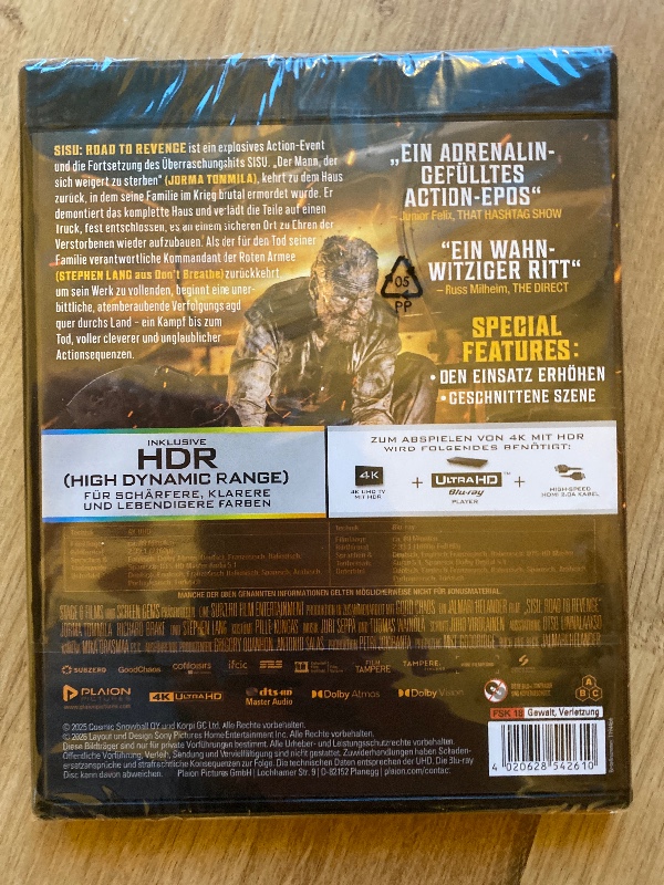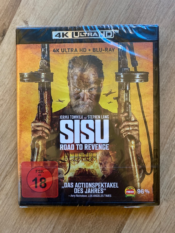 Auf der Verpackung ist klar die FSK 18-Kennzeichnung zu sehen – ein deutliches Signal, dass Sisu Road to Revenge (2025) 4K UHD Blu-ray Neu deu nicht weichgespült ist. Hier bekommst Du eine konsequente, erwachsene Action-Erfahrung, die sich eher an rauen Genre-Klassikern orientiert als an glatt polierten Blockbustern.