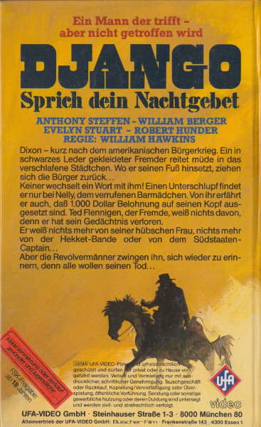 Auf dem Release sind Namen wie Anthony Steffen, William Berger, Evelyn Stewart und Robert Hundar genannt, außerdem Regie: William Hawkins. Das liest sich nach klassischer Italo-Western-Besetzung - Darsteller, die in diesem Kino zuhause sind und genau die Art kantiger Figuren liefern, die das Genre trägt: wortkarg, hart, manchmal überraschend gebrochen. Das macht Django Sprich dein Nachtgebet - UFA Hartbox VHS interessant für alle, die nicht nur „irgendeinen Western“ suchen, sondern dieses spezifische europäische Western-Feeling.