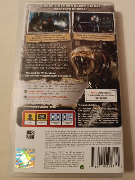 Auf der Hülle ist PSP Essentials klar ausgewiesen - das steht für eine verbreitete, gut wiedererkennbare Veröffentlichungsreihe auf der PSP. Für Sammler und Retro?Fans ist das attraktiv, weil diese Versionen oft als „verlässliche Dauerbrenner“ einer Plattform gelten. Dazu kommt: Ein Spiel wie Resistance: Retribution passt perfekt in jede PSP?Sammlung, wenn du dir ein Portfolio aus starken, storygetriebenen Actiontiteln aufbauen willst - also Games, die auch heute noch zünden, sobald die Konsole in der Hand liegt.
