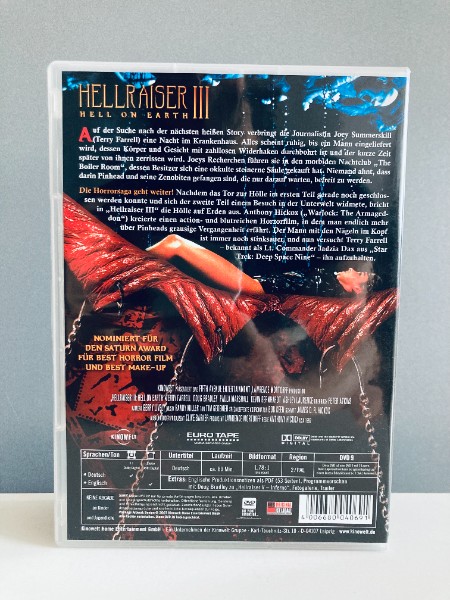 Moin … ich forste gerade meine DVD-Sammlung durch und biete euch hier den 3. Teil der HELLRAISER-Reihe. Der Film ist ungeschnitten. FSK 18. Die Disc und die Hülle sind in einem einwandfreien Zustand, neuwertig, Rauch- und tierfreier Haushalt.