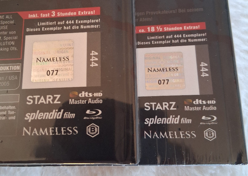 Die beiden Mb`s sind vom Hersteller - Nameless Media in der sehr raren Artwork Cover B Variante, haben beide die gleiche LE.- SonderNr. 077 und sind jeweils auf 444 Stk. limitiert.