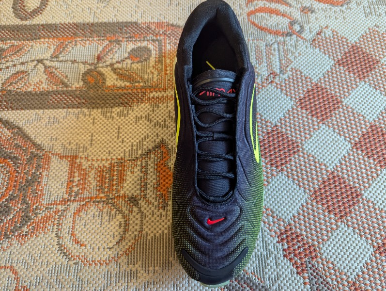 Ein echter Blickfang aus der Air-Max-Reihe: schwarze Basis, leuchtende Neon-Akzente und die massive 720-Air-Sohle, die dieses Modell so besonders macht. Der Schuh wirkt futuristisch, auffällig und gleichzeitig absolut tragbar — genau die Art Sneaker, die heute nicht mehr an jeder Ecke zu finden ist.
