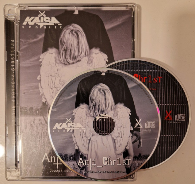 Zum Verkauf steht die 2CD-Veröffentlichung "Anti_Chr1st (auf 1000 Stück limitierte Super Premium Edition)" (Schnipp Schnapp, 2012) des Rappers Kaisaschnitt (auch bekannt als Kaisa, Myng etc.). In durchsichtiger "Jewel King Size Case" (wie DVDs) mit zusätzlichem Autogramm (signiert mit "Kaiza") und Merchandise-Handzettel; OHNE den kleinen Antecker, es sei denn, ich finde ihn noch (irgendwo ist er, das weiß ich).