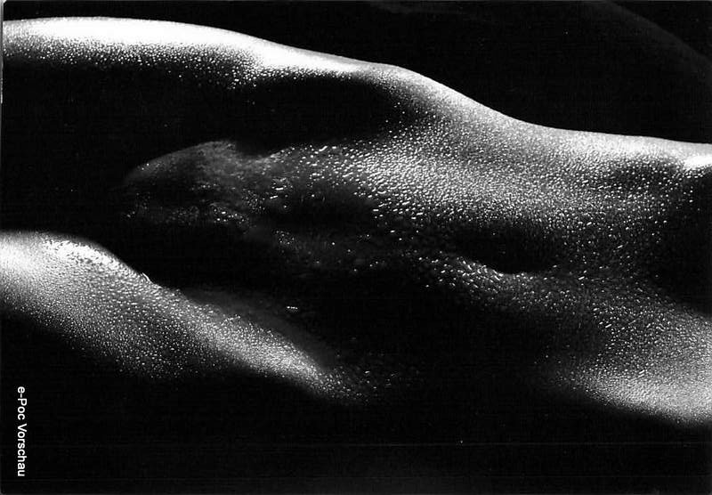 Die Aufnahme vermittelt durch das gekonnte Spiel von Licht und Schatten eine faszinierende Tiefe. Die abgebildeten Hautdetails sind fein und sorgfältig herausgearbeitet, was die Sinnlichkeit und Ästhetik des menschlichen Körpers betont. Die glänzenden Wassertropfen und die sanften Kurven des Körpers werden in einer meisterhaften Weise präsentiert, die sowohl subtil als auch ausdrucksstark ist. Dieses Bild fängt Eleganz und körperliche Poesie in Perfektion ein.